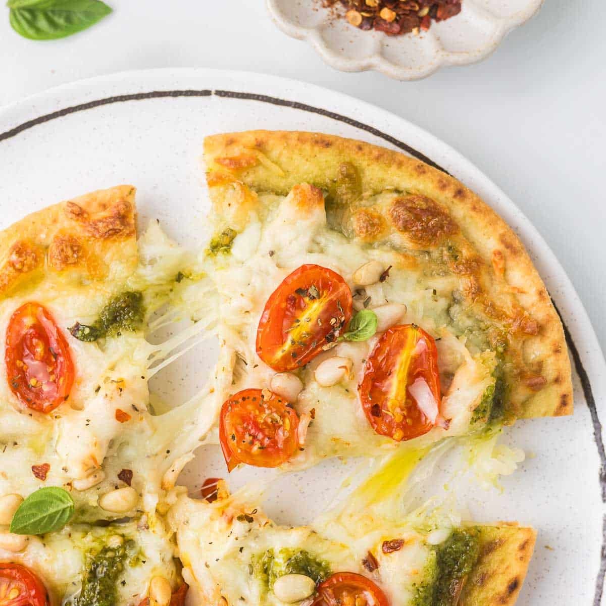 A warm flatbread topped with creamy pesto, tender chicken, melty mozzarella, and sweet tomatoes. This easy 15-minute recipe is perfect for busy nights.
