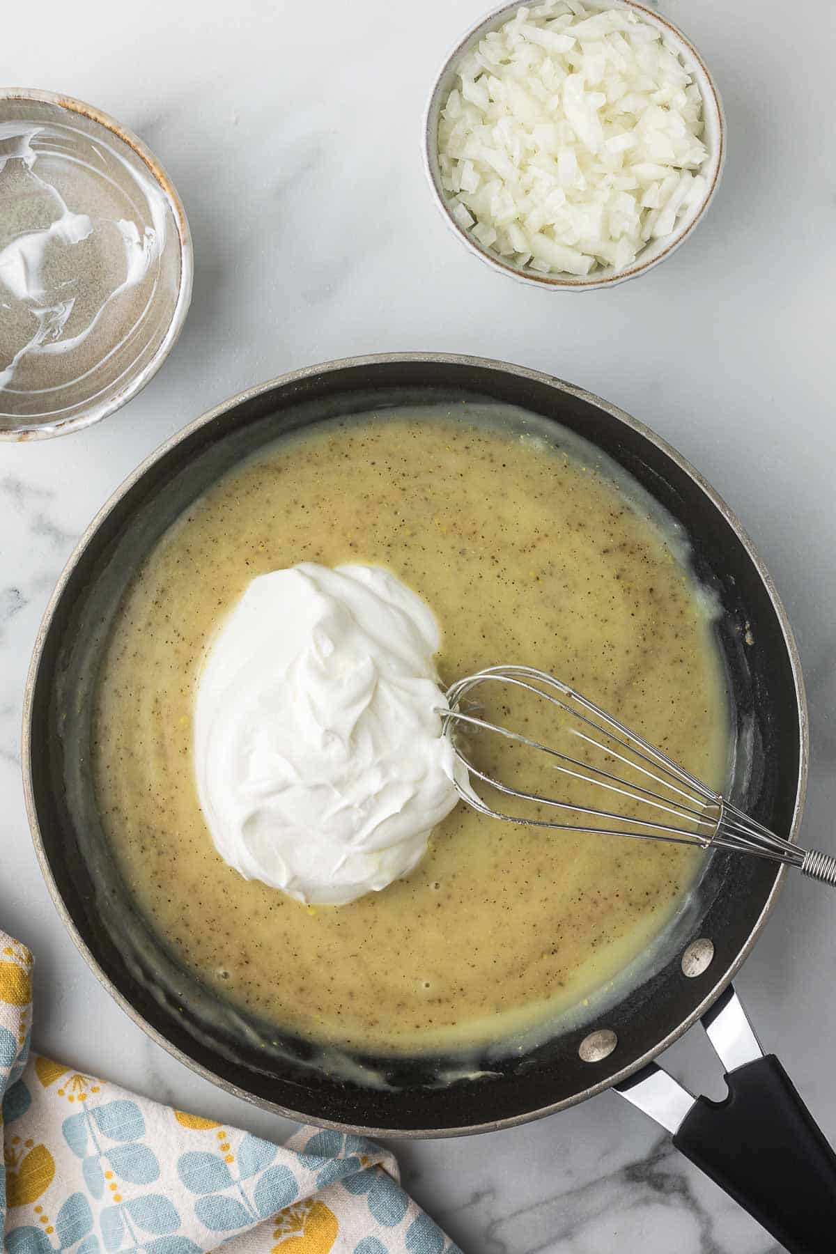 - Melt 3 tablespoons of butter in a large skillet over medium heat. Sprinkle in the flour and stir constantly for 1-2 minutes to create a roux. Gradually whisk in the chicken broth and chicken base until smooth. Add the onion powder, garlic powder, celery seed, black pepper, and salt. Cook for 2-3 minutes, stirring occasionally, until the mixture thickens slightly. Remove from heat and add sour cream.3 Tablespoon Butter, 3 Tablespoon Flour, 2 cup Chicken Broth, 2 teaspoon Chicken Base, ½ teaspoon Onion Powder, ½ teaspoon Garlic Powder, ½ teaspoon Celery Seed, ¼ teaspoon Black Pepper, 1 teaspoon Salt, 1½ cup Sour Cream