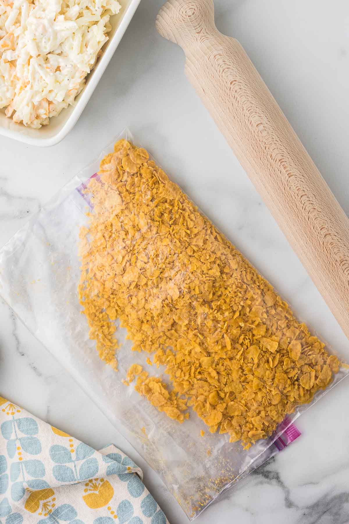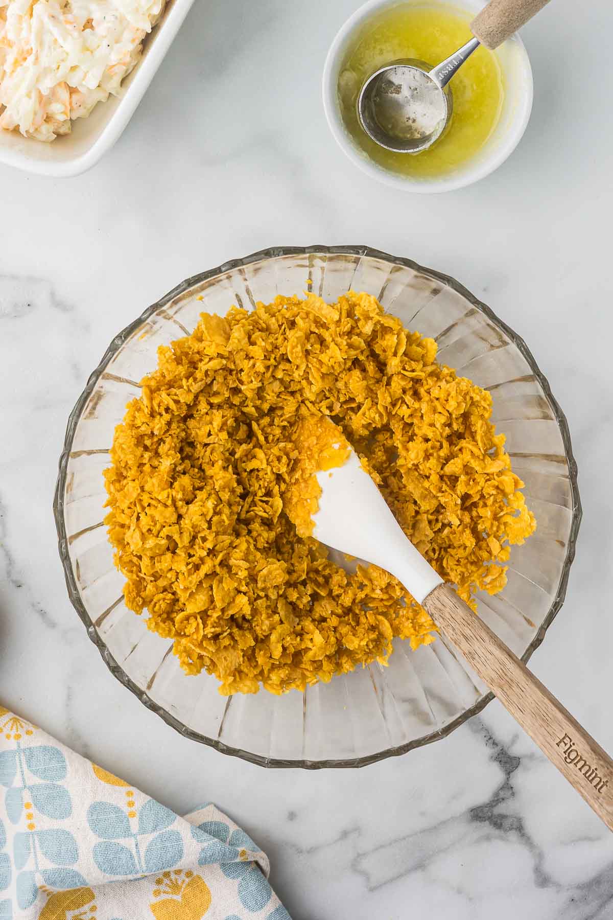 - In a small bowl, mix the crushed cornflakes with the melted 3 tablespoons of melted butter until well coated. Sprinkle the buttered cornflakes evenly over the hashbrown mixture.2 cups Corn Flakes, 3 Tablespoons Melted Butter