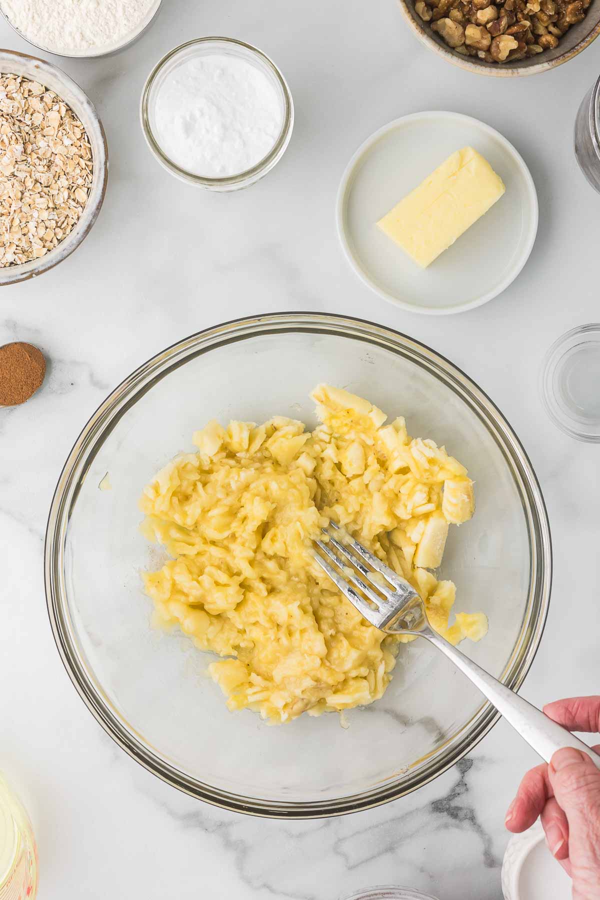 Step 2: In a medium bowl, mash the bananas until smooth.