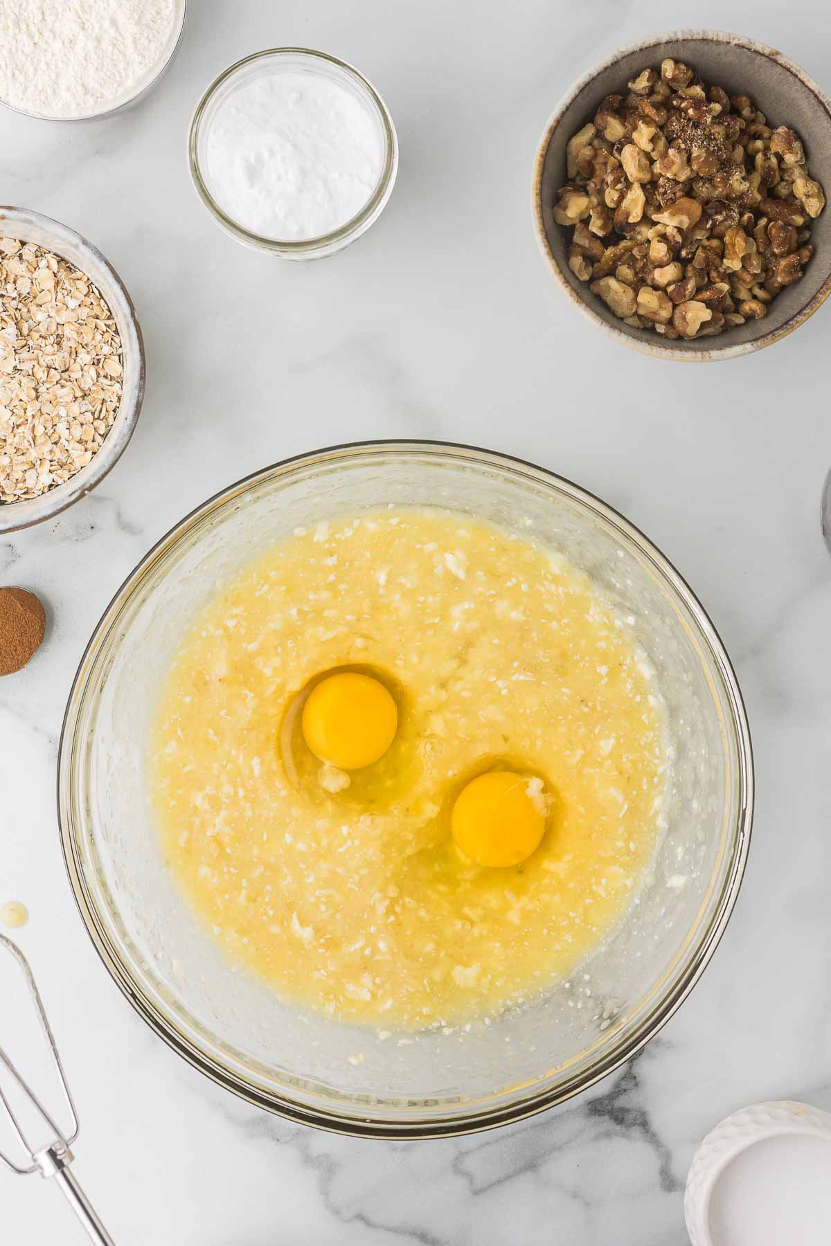 - In a medium bowl, mash the bananas until smooth. Add the sugar, oil, softened butter, and eggs, mixing until well combined. Stir in the vanilla extract.2 Ripe Bananas, 1 cup Granulated Sugar, ¼ cup Oil, ¼ cup Butter, 2 Eggs, 1 teaspoon Vanilla Extract