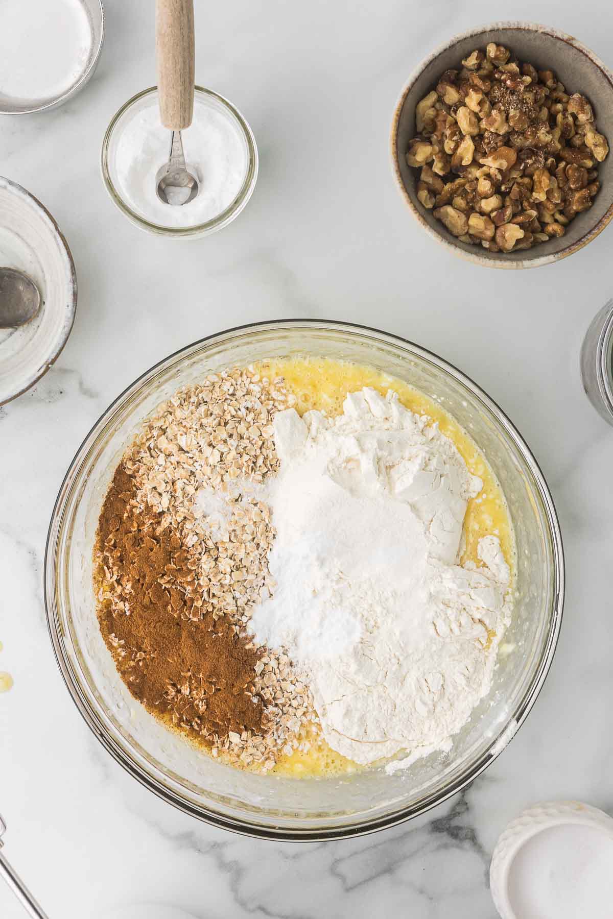 - In a large bowl, whisk together the flour, rolled oats, baking soda, cinnamon, and salt.1 cup All-Purpose Flour, ¾ cup Rolled Oats, 1 teaspoon Baking Soda, ½ teaspoon Cinnamon, ½ teaspoon Salt