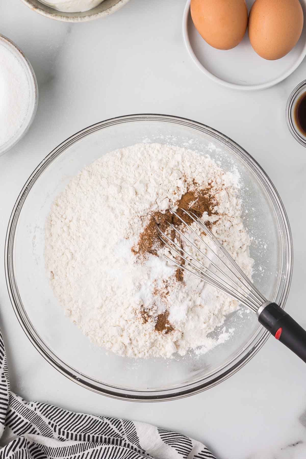 - Whisk together the flour, baking soda, cinnamon, and salt in a small bowl. Set aside.1¾ cup All Purpose Flour, 2 teaspoon Baking Powder, ½ teaspoon Salt, ½ teaspoon Cinnamon