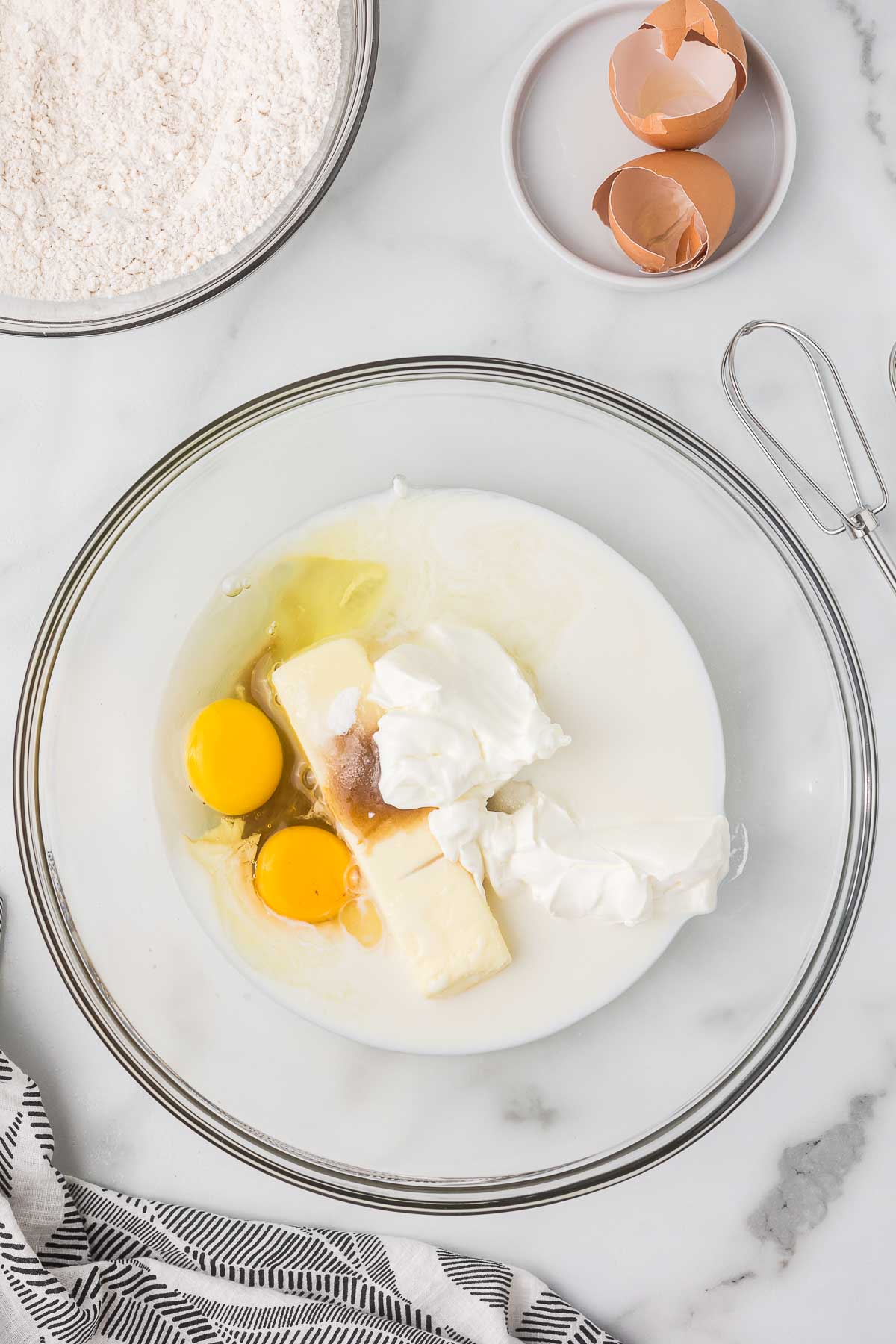 Step 3: Combine the softened butter, sugar, sour cream, milk, eggs, and vanilla in a large bowl. Mix well.