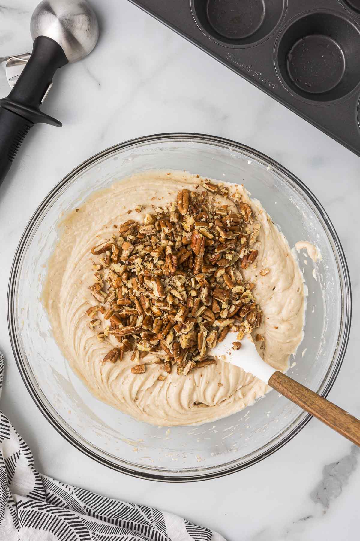 - Mix in chopped nuts. Spoon the mixture evenly into each cup or the paper liners.½ cup Pecans