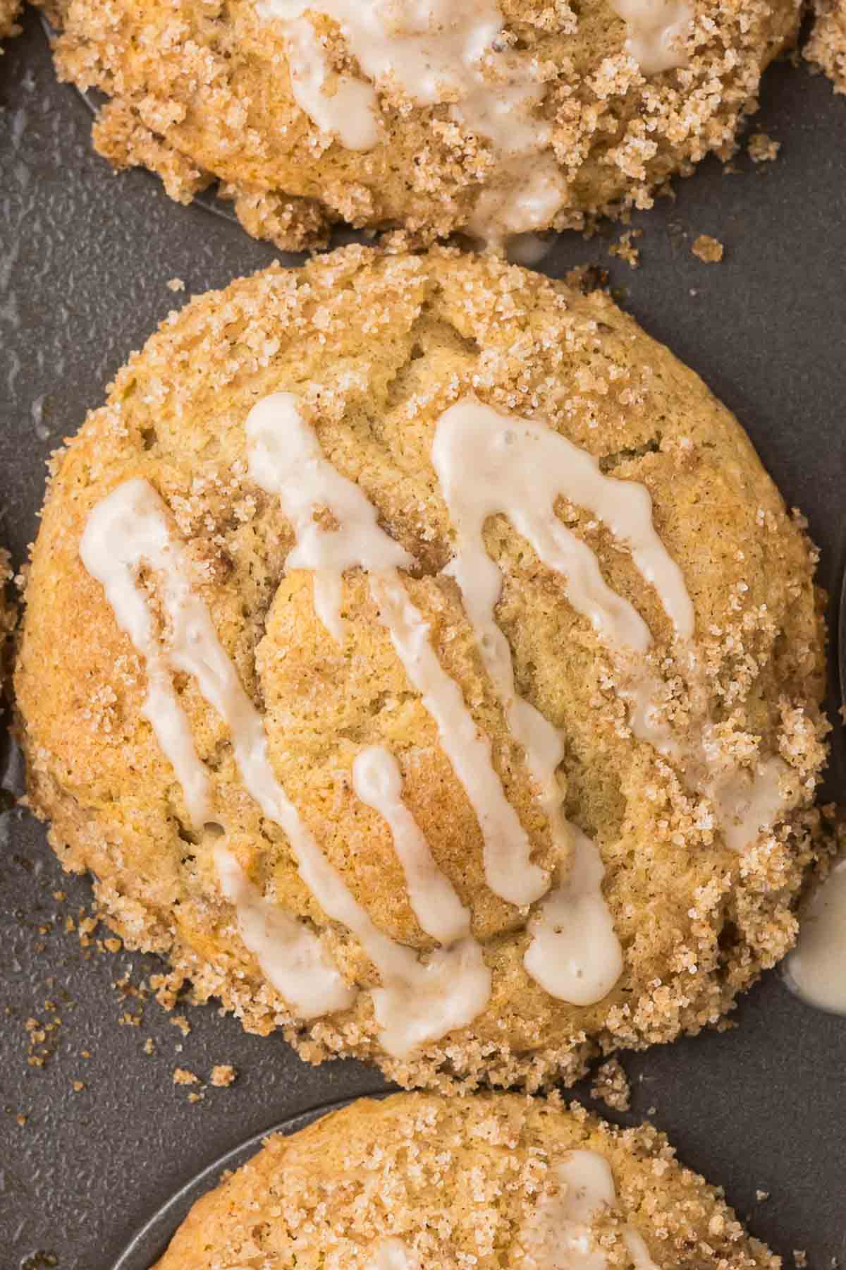 I tested this recipe over and over to get the perfect balance of moist, fluffy muffins with a crunchy, sweet topping. There were some mishaps along the way (let’s just say generously greasing the pan is necessary!), but after tweaking the crumble topping, adjusting the milk, and experimenting with different drizzles—including cream cheese frosting—I finally landed on the perfect version.