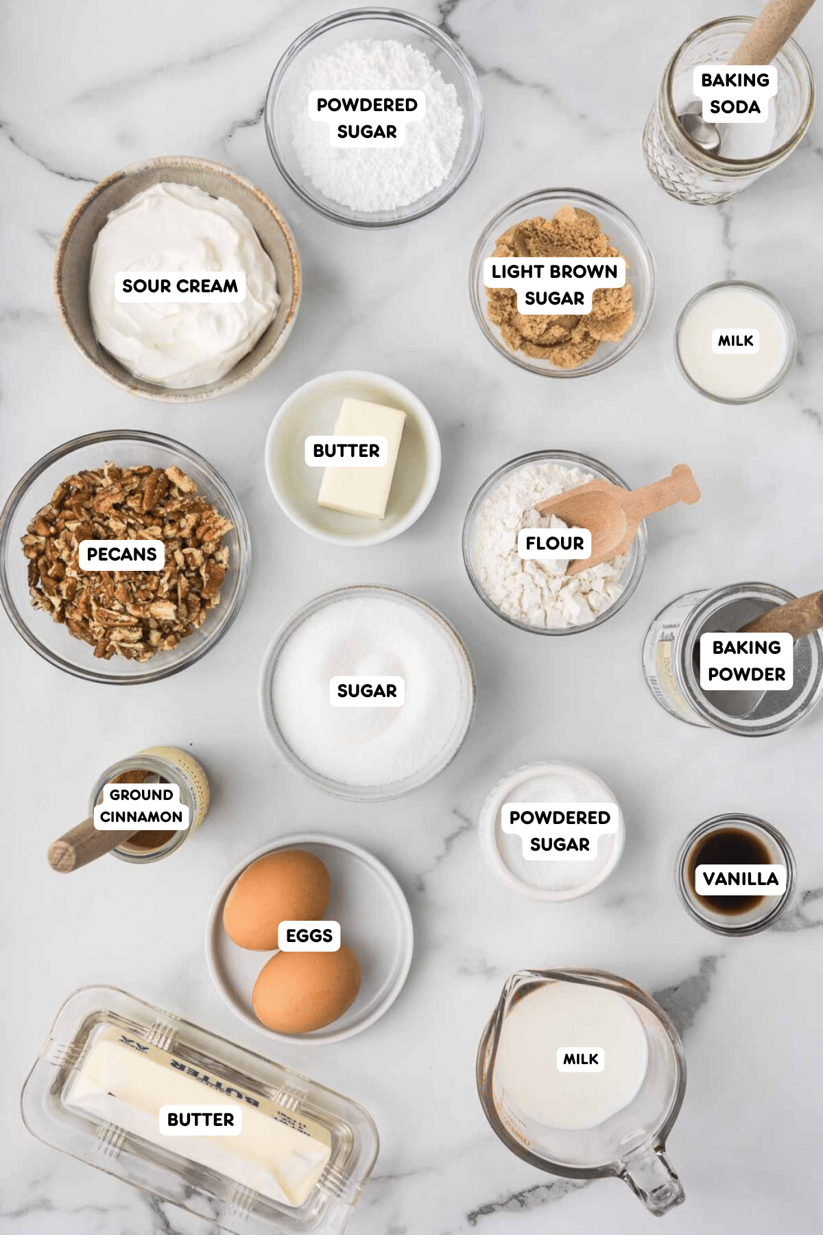 - In a large bowl, mix the softened butter, vanilla, sugar, eggs, sour cream, and milk.½ cup Butter, ¾ cup Granulated Sugar, 2 Eggs, 1 teaspoon Vanilla, ½ cup Sour Cream, ¼ cup Milk, ½ teaspoon Baking Soda