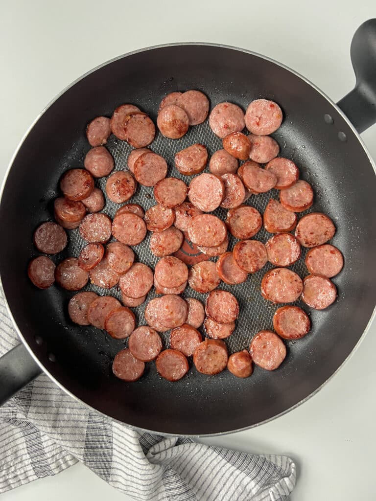 Step 2: Add the smoked sausage and sear both sides. Remove the sausage from the pan and set aside with the shrimp.