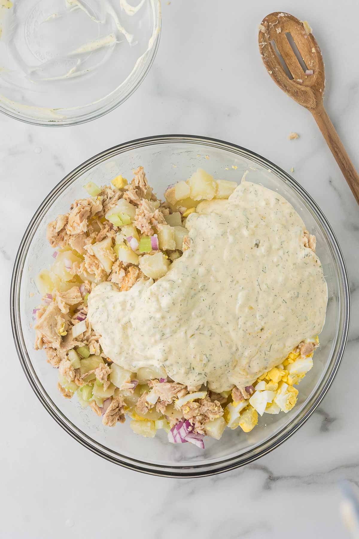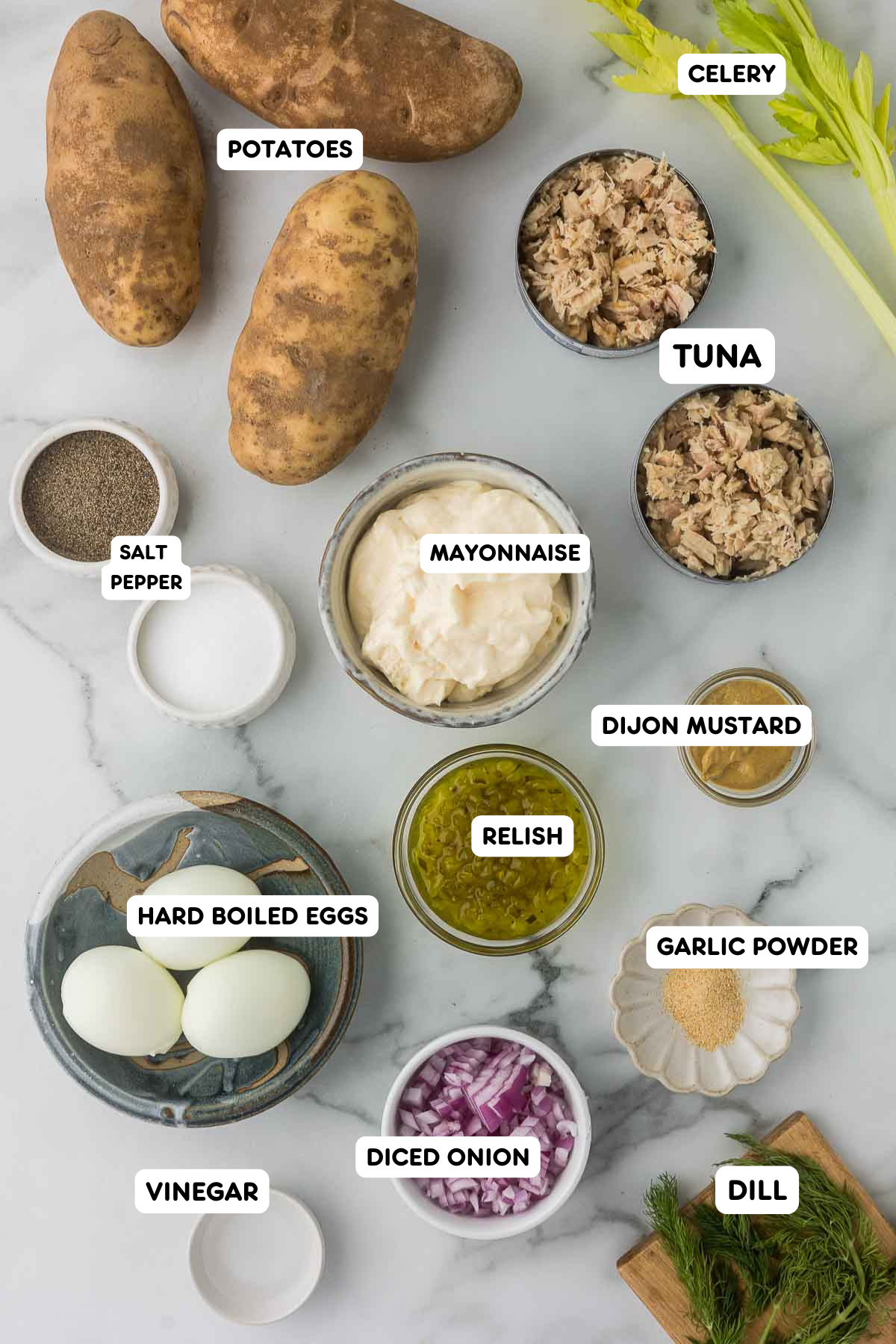 - In a large mixing bowl, gently toss the cooled potatoes with the tuna, chopped eggs, celery, onion, and pickles. Pour the dressing over the top and gently stir to combine.2 5 ounce cans Tuna, 3 Hard-boiled Eggs, ½ cup Celery, ⅓ cup Red Onion, ¼ cup Sweet Relish, 1-2 Tablespoon Fresh Dill