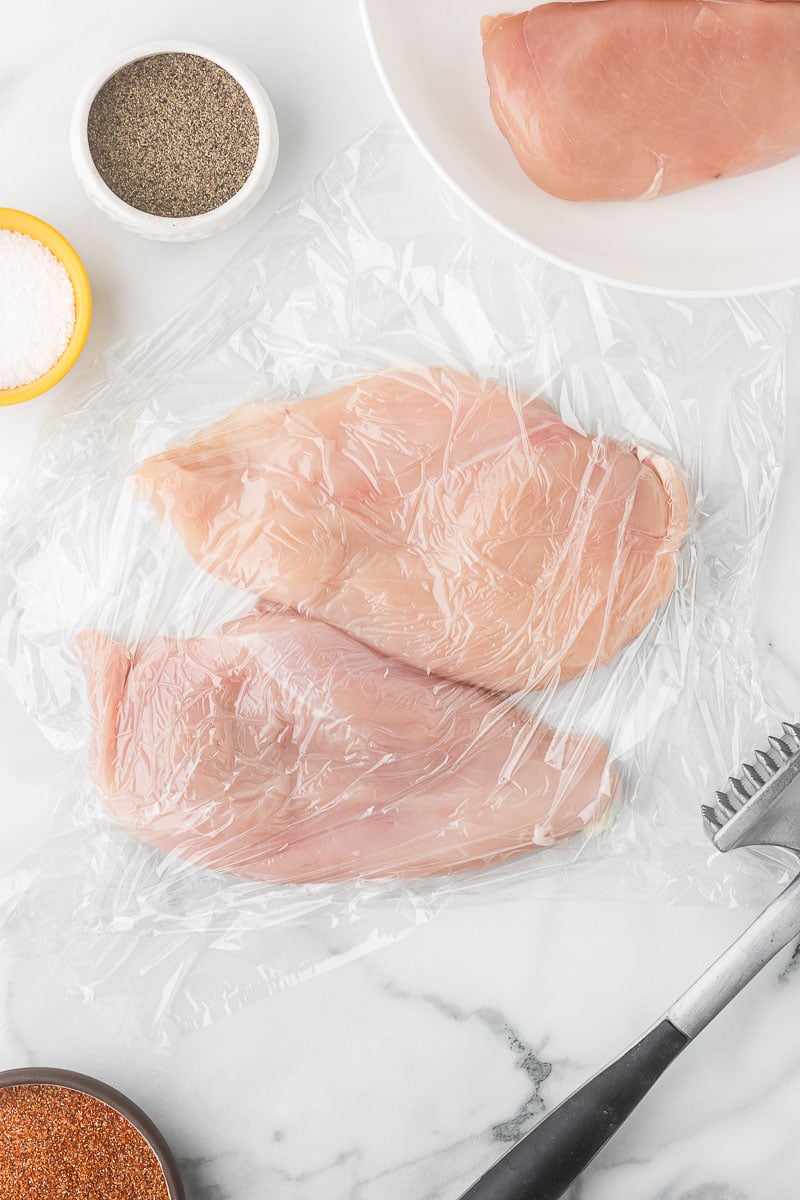 - Place each chicken breast between two pieces of plastic wrap and gently pound with a mallet until they are an even thickness (about ½–¾ inch). This helps them cook evenly.