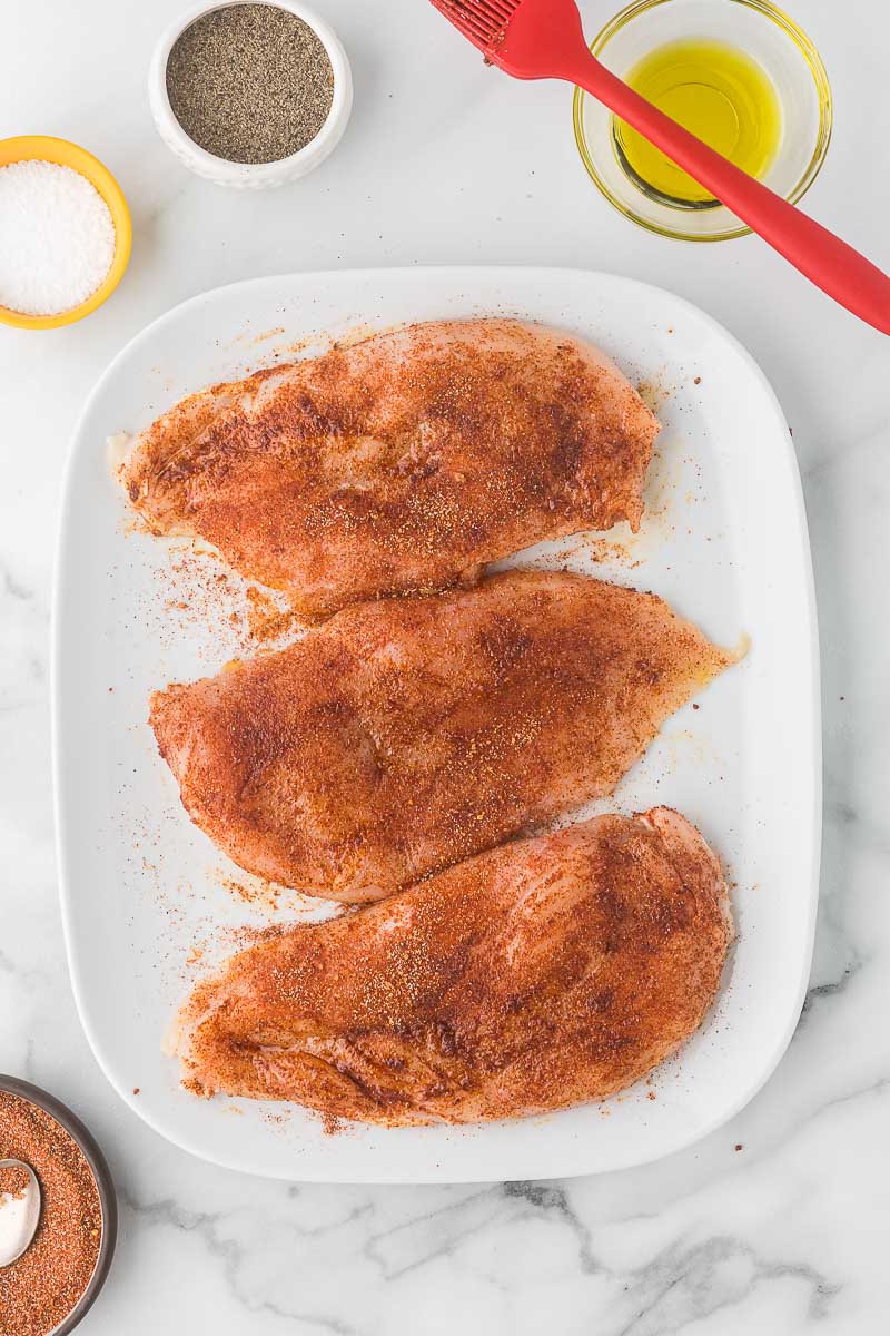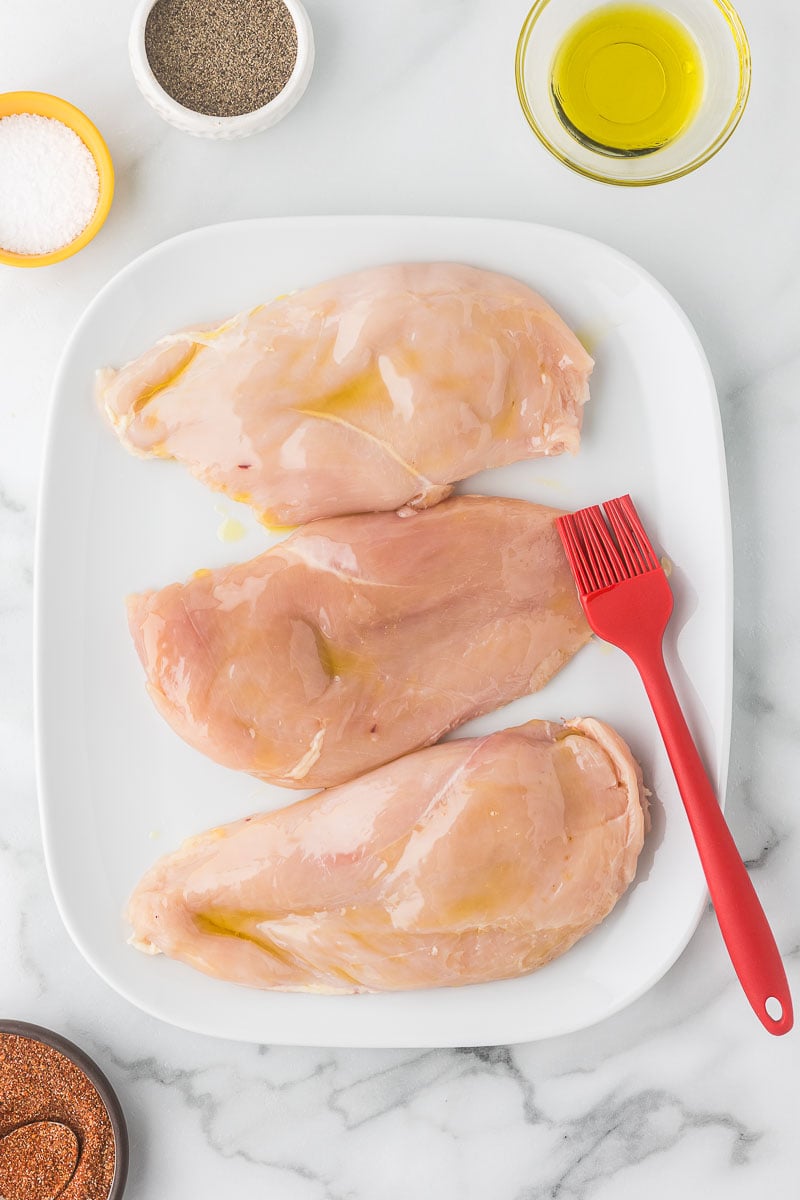 - Drizzle the chicken with olive oil and rub it in on both sides.1 Tablespoon Olive Oil
