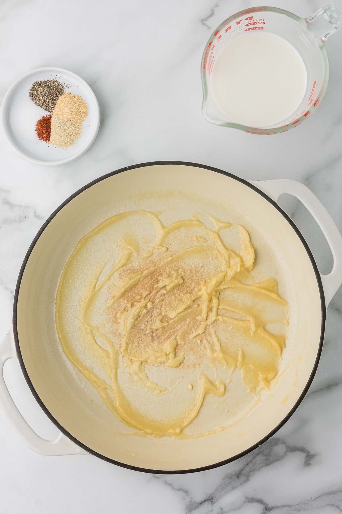 - In a medium saucepan, melt the butter over medium heat. Once melted, whisk in the flour and cook for 1-2 minutes until lightly golden and bubbly, creating a roux.2 Tablespoons Butter, 2 Tablespoons All-Purpose Flour