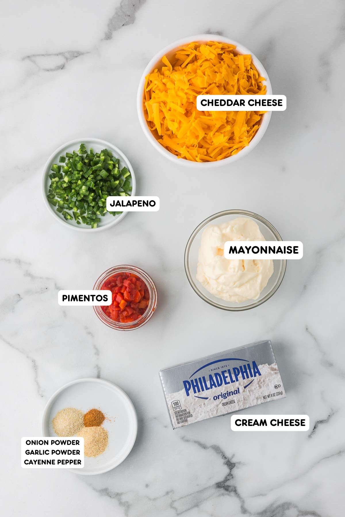 - Add the cheddar cheese, pimentos, and jalapeños to the cream cheese mixture. Stir until fully combined.8 ounces Cheddar cheese, 4 ounces Pimentos, 2 Jalapeño