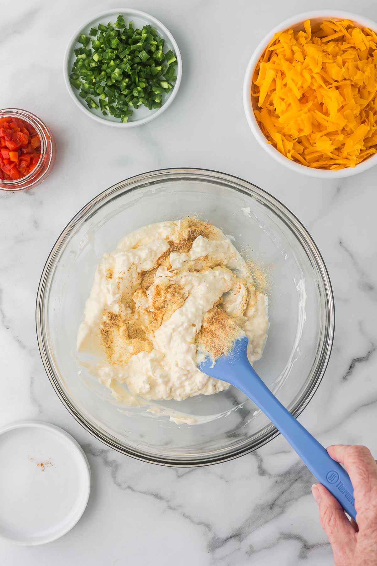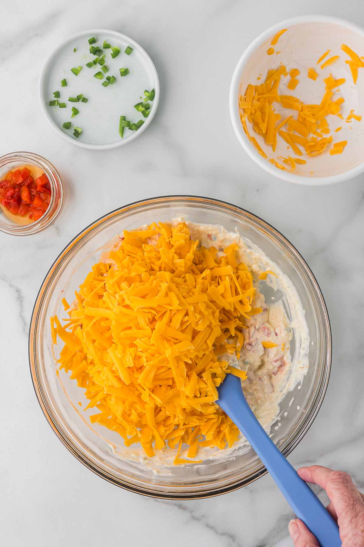 Step 2: Add the cheddar cheese, pimentos, and jalapeños to the cream cheese mixture.