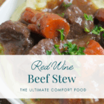 Red Wine Beef Stew is a classic recipe with tender beef, onions and carrots in a rich red wine sauce. Serve this for a fancy dinner party or for a laid back Sunday afternoon supper.