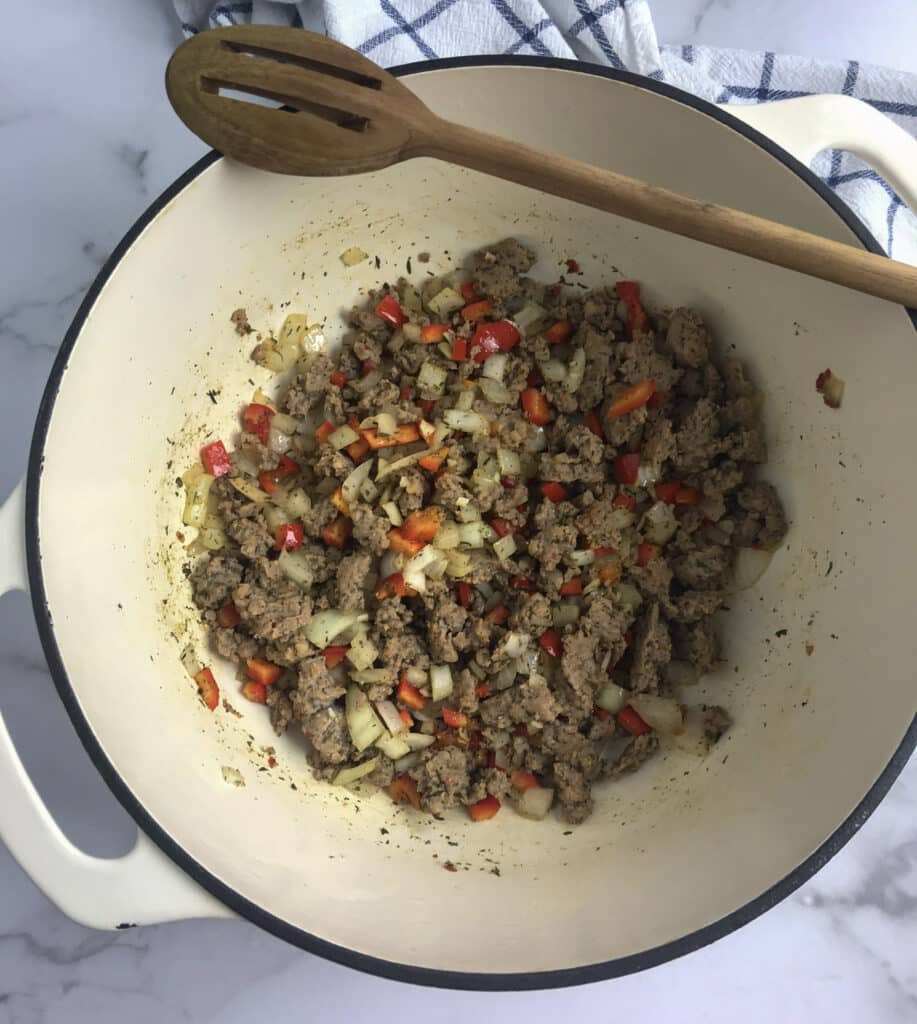 Step 1: In a large pot or Dutch oven, brown the ground sausage over medium-high heat. Drain off most of the sausage drippings.