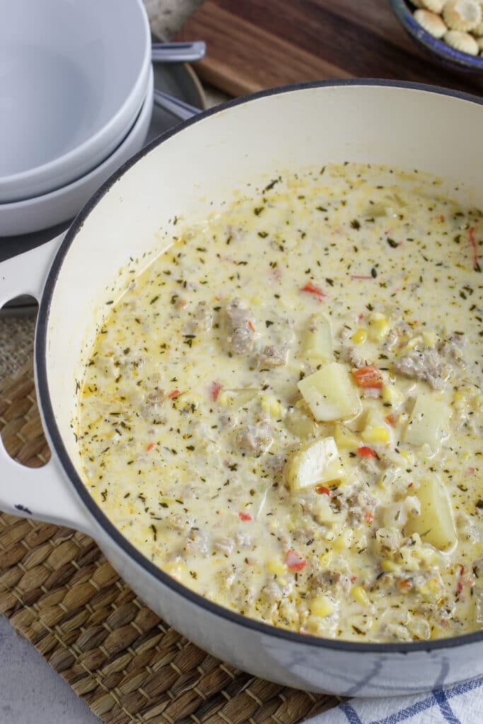 Sausage Corn Chowder is made in one pot with Italian sausage, fresh or frozen corn, onions, potatoes, and cream cheese. This creamy chowder is thick, filling, and has a surprise kick with the addition of Italian sausage instead of bacon.