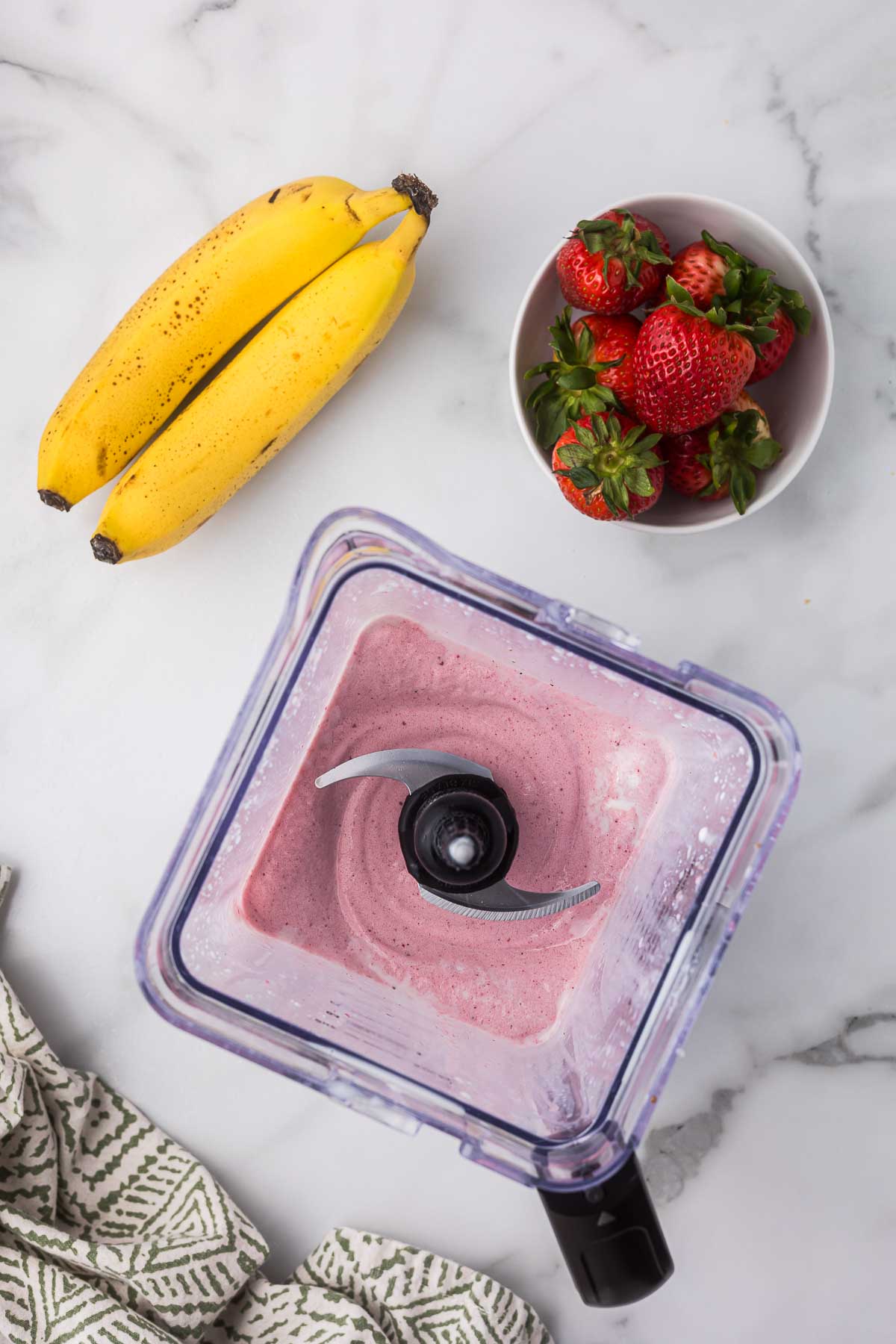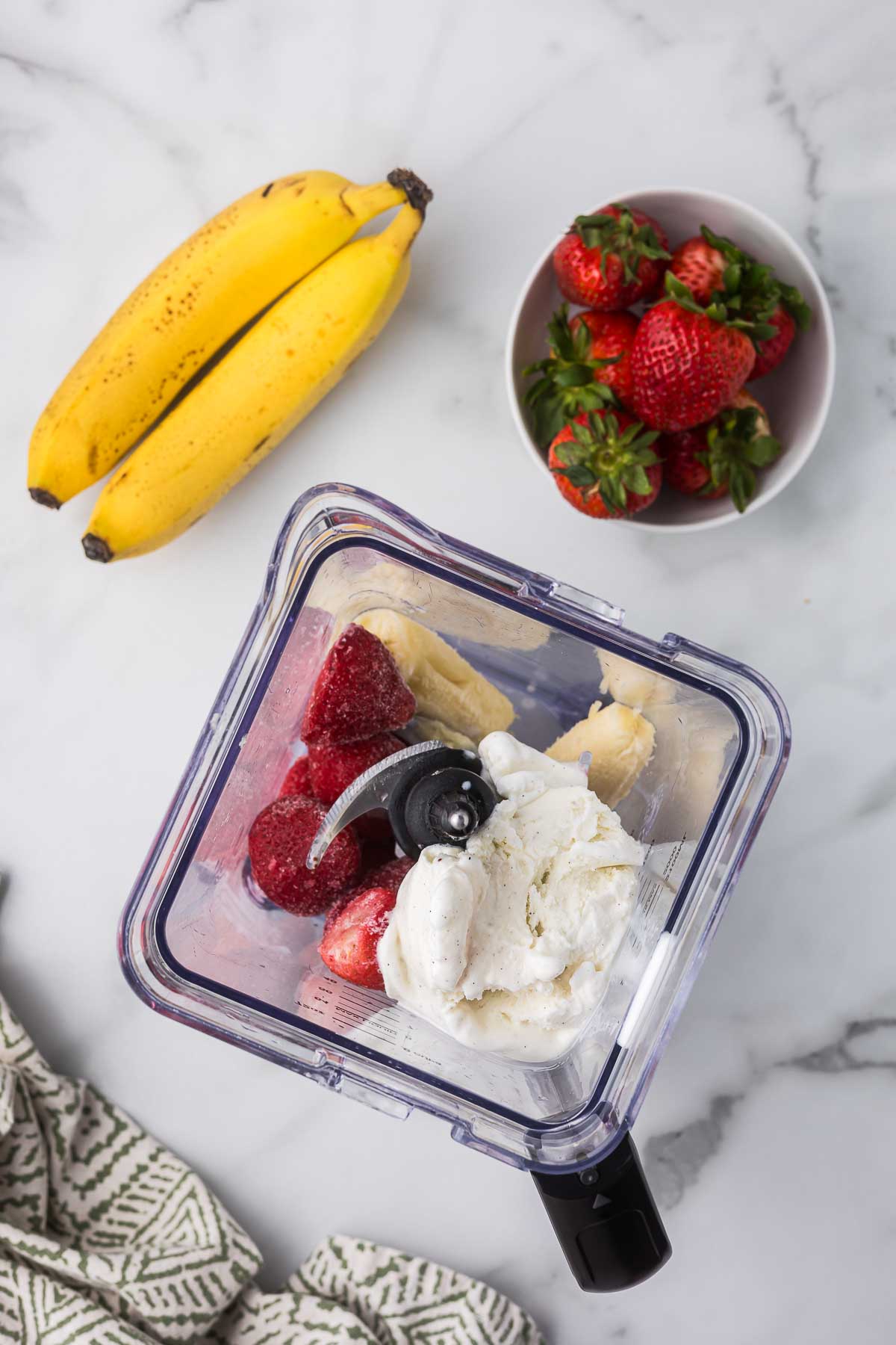 - Add ice cream, banana, strawberries, and milk to a blender. Pulse until smooth.2 cup Strawberries, 1 Banana, 2 cup Ice Cream, 1/4 cup Milk