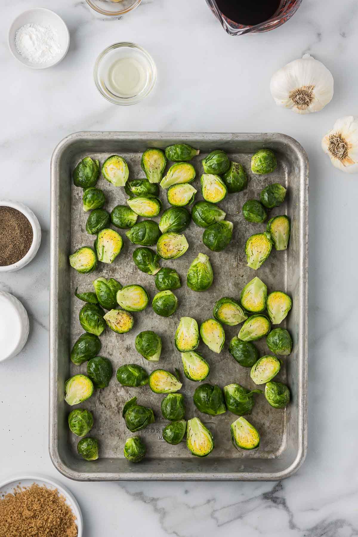 - Brussels Sprouts – Look for fresh Brussels sprouts that are roughly the same size, then trim, remove the outer leaves, and cut them in half.