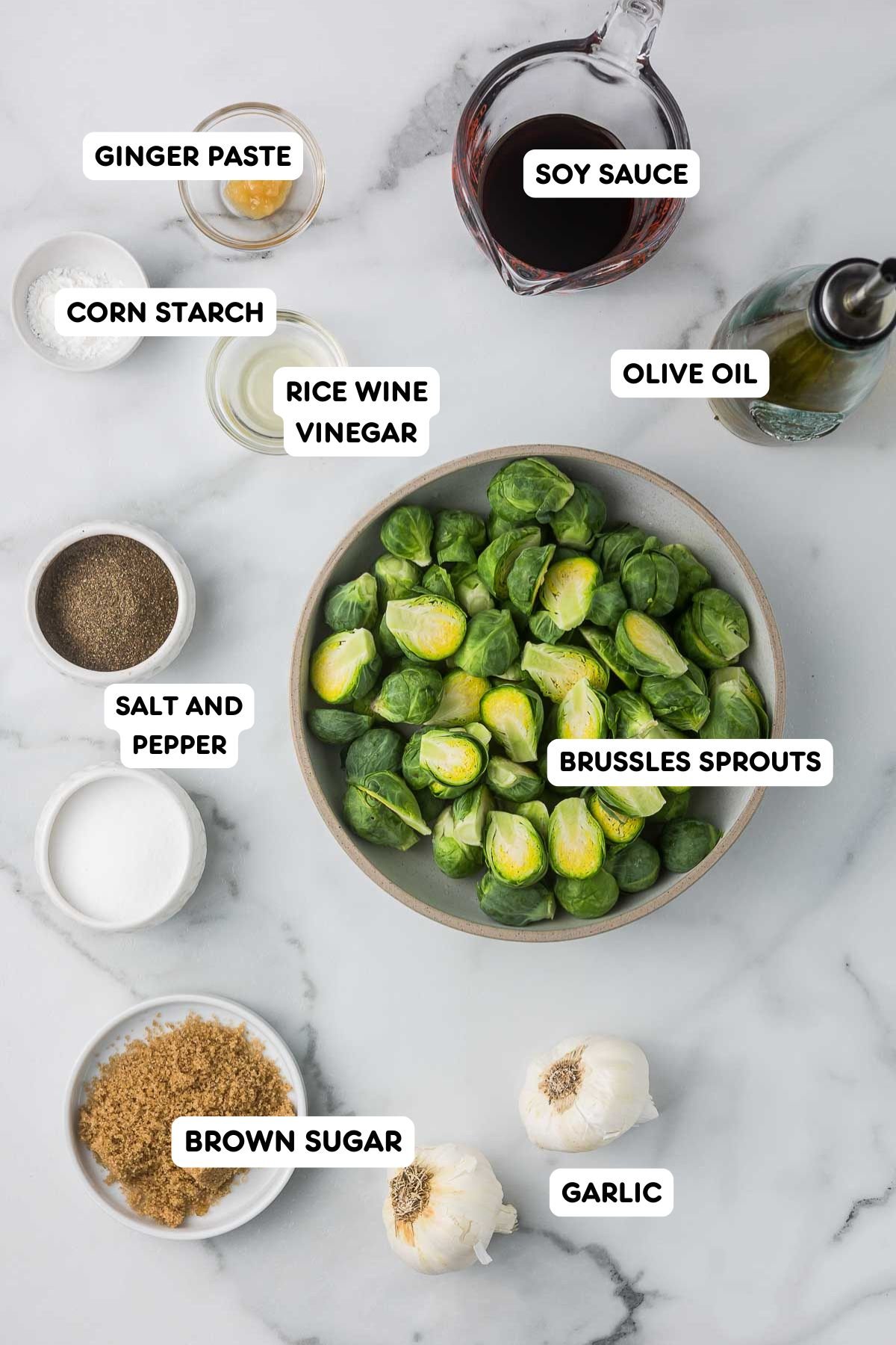 - While the Brussels sprouts roast, add soy sauce, rice wine vinegar, brown sugar, garlic, ginger paste, and red pepper flakes to a small saucepan. Combine water and cornstarch and add to the sauce ingredients. Bring the sauce to a low simmer, stirring occasionally, until the sugar dissolves and the mixture begins to thicken.¼ Cup Soy Sauce, 2 teaspoons Rice Wine Vinegar, 2 Tablespoons Brown Sugar, 1 Clove Garlic, ½ teaspoon Ginger Paste, ⅛ teaspoon Red Pepper Flakes, 1 ½ teaspoon Cornstarch, ¼ cup Water