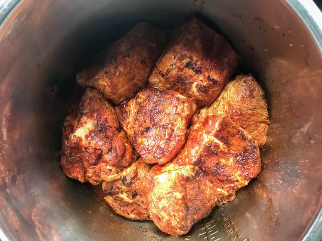 Once all the meat is browned and removed from the pot, add water to de-glaze the bottom. Cancel the Saute function and stir to loosen the burnt bits off the bottom. Those bits are full of flavor.